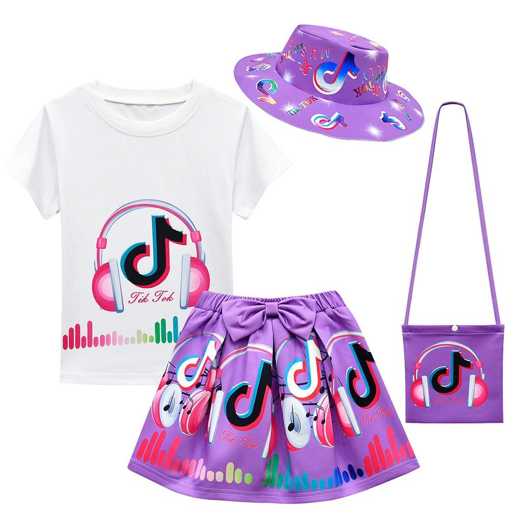 Girls Tik Tok Print T Shirt Hat Bag And Skirt Suit Set Summer Costume. The so cute and comfortable summer skirt suit with so smart and creative design is very suitable for your bright, lively and lovely little girl.