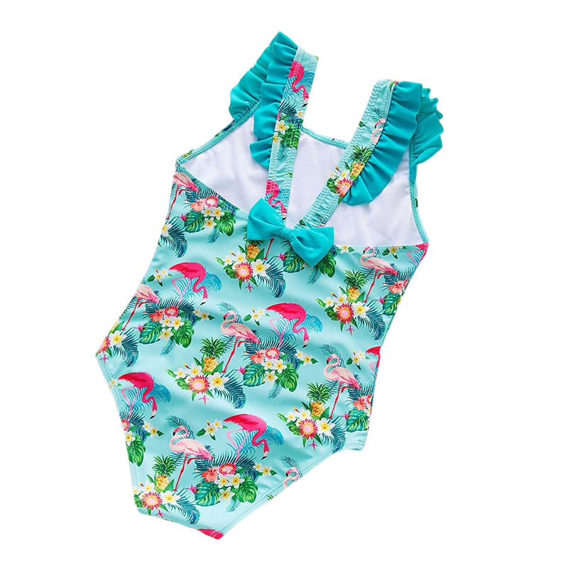 Girls Tropical Palm Flamingo Print Ruffle Shoulder One Piece Swimsuit. It is very softy, breathable and comfortable to wear.