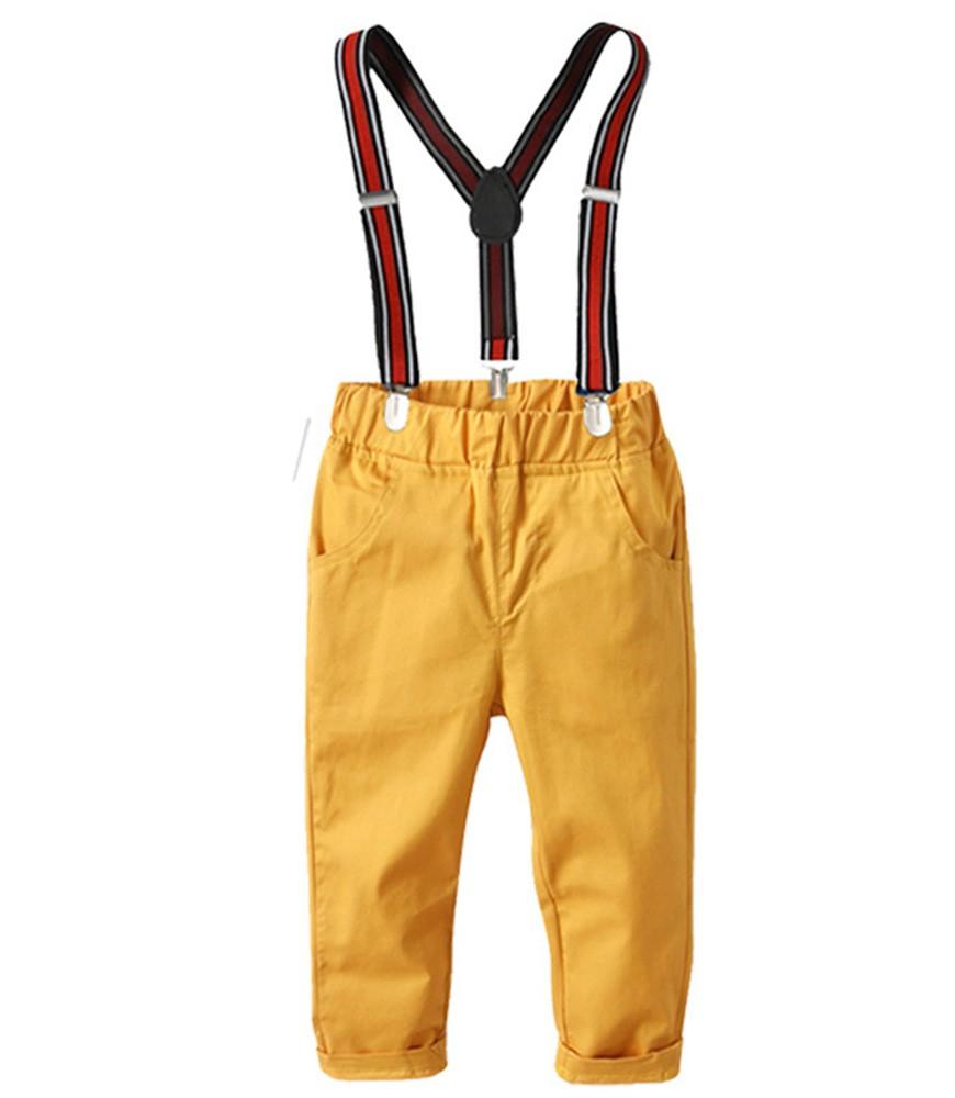 Green Cotton Shirt With Bow Tie And Yellow Suspender Pants Boys Outfit